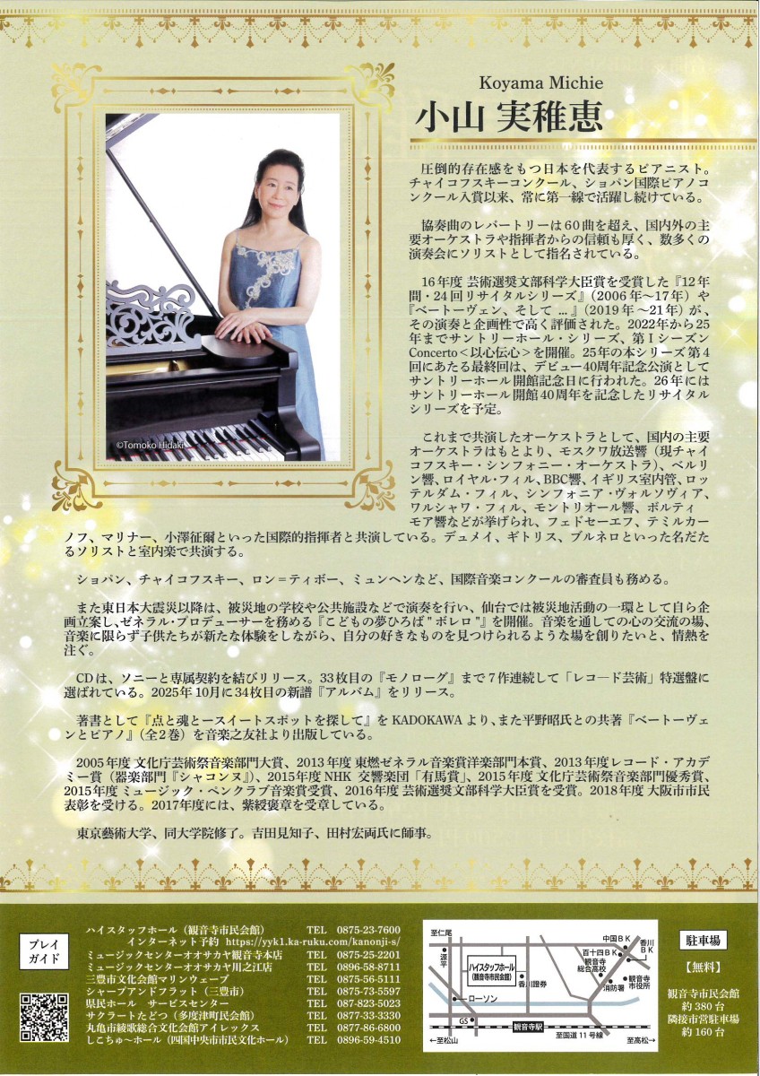 小山実稚恵 ピアノ・リサイタル ※クリックで拡大します。 2026/05/16(土) 開演 14:00 開場13:30 販売中 総合開発PRESENTS 小山実稚恵 ピアノ・リサイタル 圧倒的存在感 日本を代表するピアニスト 観音寺に再び ◆ 開催日:2026年5月16日(土) 開場 13:30 開演 14:00 ◆ 会場:ハイスタッフホール(観音寺市民会館)大ホール ◆ チケット料金:全席指定 一般 4,500 円 高校生以下 1,500 円 ※未就学児入場不可 ◆ 問い合わせ:ハイスタッフホール(観音寺市民会館) TEL 0875-23-3939