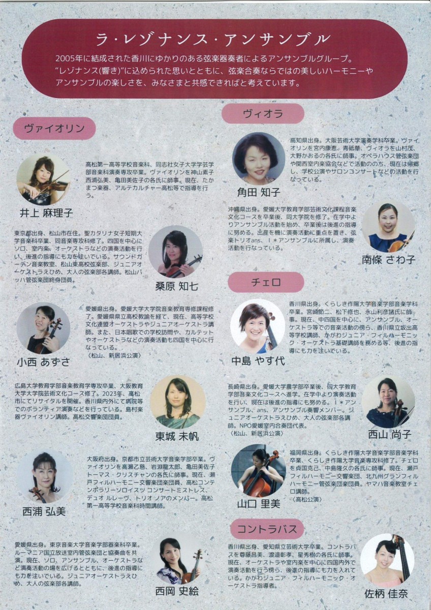 La Résonance Ensemble ※クリックで拡大します。 2026/05/10(日) 開演 14:00 開場 13:30 販売中 La Résonance Ensemble ◆開催日:2026年5月10日(日)開演 14:00(開場 13:30) ◆会場:サンポートホール高松 第1小ホール ◆入場料:一般 2,000円 学生 1,000円(大学生以下) ※未就学児の入場はご遠慮ください ◆問合せ先:ラ・レゾナンス・アンサンブル TEL:090-4979-5635 ( 西浦 )