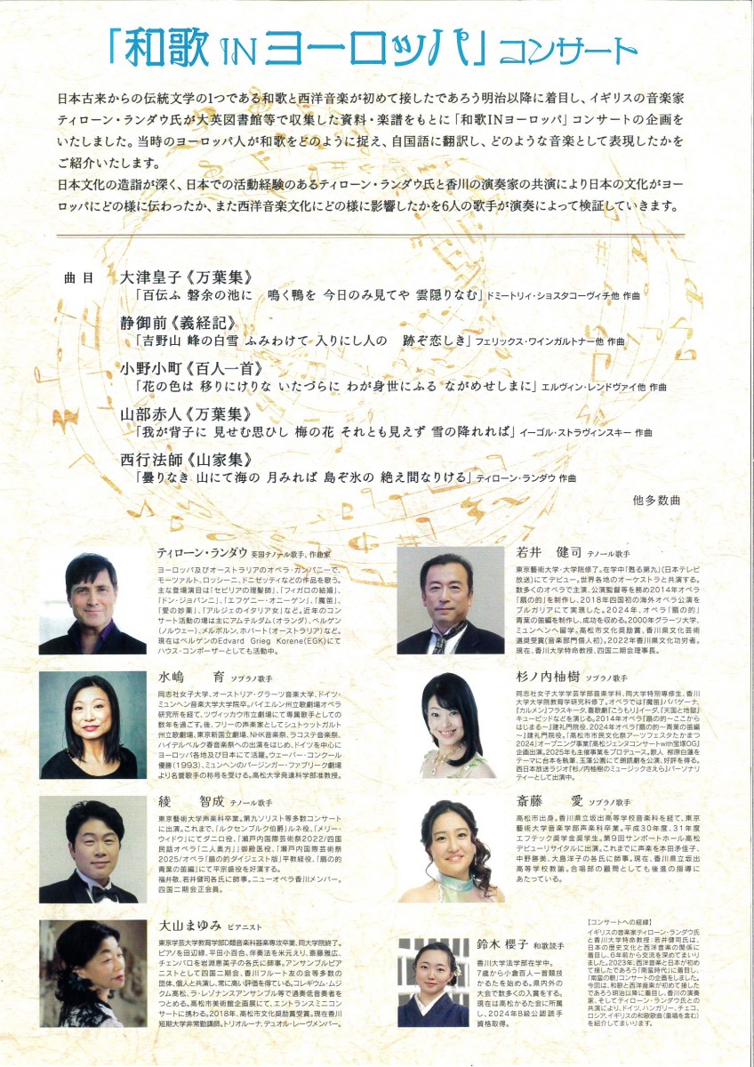 「和歌INヨーロッパ」コンサート ※クリックで拡大します。 2025/11/09(日) 開演 14:00 開場 13:30 販売中 日本文化と西洋音楽の融合 「和歌INヨーロッパ」コンサート ◆開催日:2025年11月9日(日) 開演 14:00 開場 13:30 ◆会場:香川県文化会館・芸能ホール ◆チケット料金:全席自由席 一般 2,000 円 学生 1,000 円 ◆問い合わせ:090-4507-5308(若井)